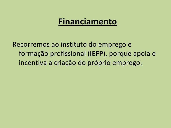 12. 12. <ul><li>Financiamento </li></ul><ul><li>Recorremos ao instituto do emprego e formação profissional ( IEFP ), porque apoia e incentiva a criação do próprio emprego. </li></ul>