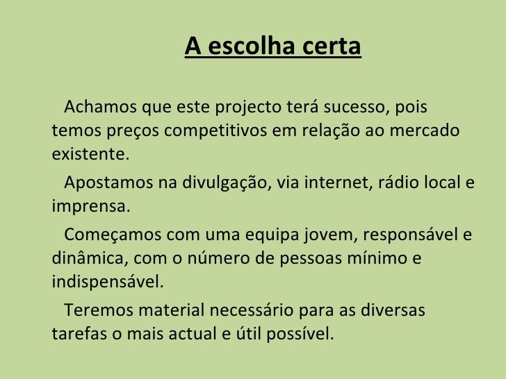 14. 14. <ul><li>A escolha certa </li></ul><ul><li>Achamos que este projecto terá sucesso, pois temos preços competitivos em relação ao mercado existente. </li></ul><ul><li>Apostamos na divulgação, via internet, rádio local e imprensa. </li></ul><ul><li>Começamos com uma equipa jovem, responsável e dinâmica, com o número de pessoas mínimo e indispensável. </li></ul><ul><li>Teremos material necessário para as diversas tarefas o mais actual e útil possível. </li></ul>