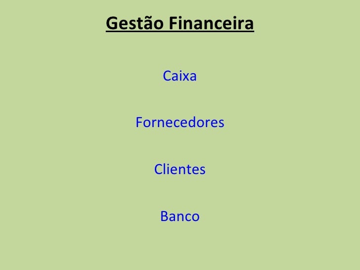 17. 17. Gestão Financeira <ul><li>Caixa </li></ul><ul><li>Fornecedores </li></ul><ul><li>Clientes </li></ul><ul><li>Banco </li></ul>