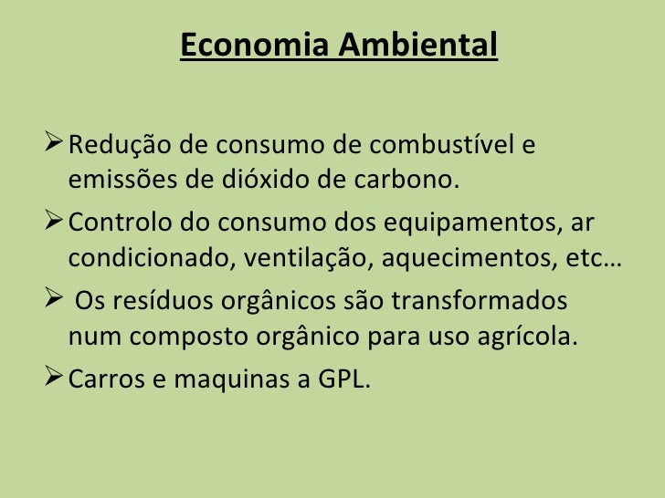 18. 18. <ul><li>Economia Ambiental </li></ul><ul><li>Redução de consumo de combustível e emissões de dióxido de carbono. </li></ul><ul><li>Controlo do consumo dos equipamentos, ar condicionado, ventilação, aquecimentos, etc… </li></ul><ul><li>Os resíduos orgânicos são transformados num composto orgânico para uso agrícola. </li></ul><ul><li>Carros e maquinas a GPL. </li></ul>