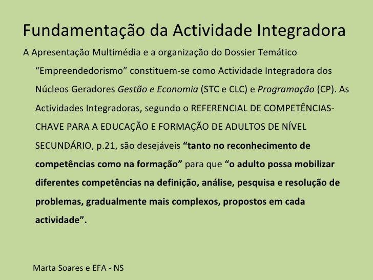 2. 2. Fundamentação da Actividade Integradora  <ul><li>A Apresentação Multimédia e a organização do Dossier Temático “Empreendedorismo” constituem-se como Actividade Integradora dos Núcleos Geradores Gestão e Economia (STC e CLC) e Programação (CP). As Actividades Integradoras, segundo o REFERENCIAL DE COMPETÊNCIAS-CHAVE PARA A EDUCAÇÃO E FORMAÇÃO DE ADULTOS DE NÍVEL SECUNDÁRIO, p.21, são desejáveis “tanto no reconhecimento de competências como na formação” para que “o adulto possa mobilizar diferentes competências na definição, análise, pesquisa e resolução de problemas, gradualmente mais complexos, propostos em cada actividade”.     </li></ul>Marta Soares e EFA - NS