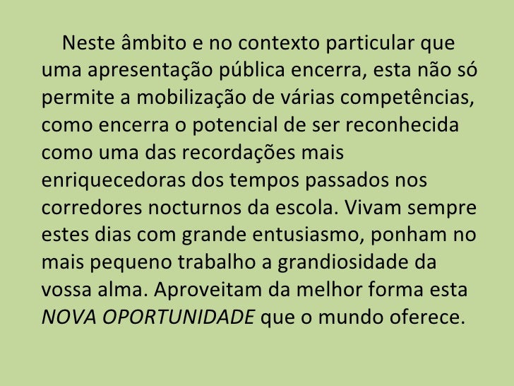 3. 3. Neste âmbito e no contexto particular que uma apresentação pública encerra, esta não só permite a mobilização de várias competências, como encerra o potencial de ser reconhecida como uma das recordações mais enriquecedoras dos tempos passados nos corredores nocturnos da escola. Vivam sempre estes dias com grande entusiasmo, ponham no mais pequeno trabalho a grandiosidade da vossa alma. Aproveitam da melhor forma esta NOVA OPORTUNIDADE que o mundo oferece.