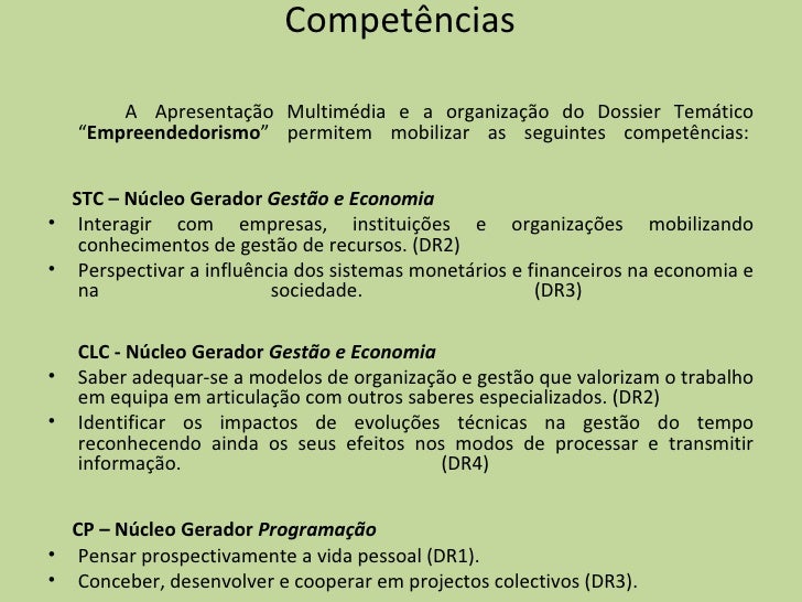 4. 4. Competências  <ul><li>A  Apresentação Multimédia e a organização do Dossier Temático “ Empreendedorismo ” permitem mobilizar as seguintes competências:    </li></ul><ul><li>STC – Núcleo Gerador Gestão e Economia </li></ul><ul><li>Interagir com empresas, instituições e organizações mobilizando conhecimentos de gestão de recursos. (DR2) </li></ul><ul><li>Perspectivar a influência dos sistemas monetários e financeiros na economia e na sociedade. (DR3)     CLC - Núcleo Gerador Gestão e Economia </li></ul><ul><li>Saber adequar-se a modelos de organização e gestão que valorizam o trabalho em equipa em articulação com outros saberes especializados. (DR2) </li></ul><ul><li>Identificar os impactos de evoluções técnicas na gestão do tempo reconhecendo ainda os seus efeitos nos modos de processar e transmitir informação. (DR4)     </li></ul><ul><li>CP – Núcleo Gerador Programação </li></ul><ul><li>Pensar prospectivamente a vida pessoal (DR1). </li></ul><ul><li>Conceber, desenvolver e cooperar em projectos colectivos (DR3). </li></ul>