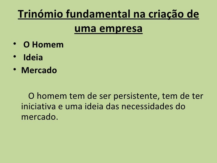 6. 6. Trinómio fundamental na criação de uma empresa <ul><li>O Homem </li></ul><ul><li>Ideia </li></ul><ul><li>Mercado </li></ul><ul><li>O homem tem de ser persistente, tem de ter iniciativa e uma ideia das necessidades do mercado. </li></ul>