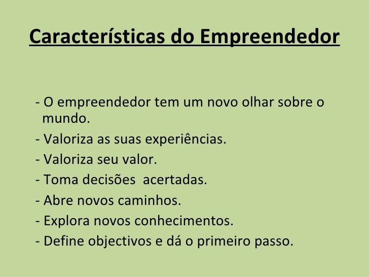 7. 7. Características do Empreendedor - O empreendedor tem um novo olhar sobre o mundo. - Valoriza as suas experiências. - Valoriza seu valor. - Toma decisões acertadas. - Abre novos caminhos. - Explora novos conhecimentos. - Define objectivos e dá o primeiro passo.