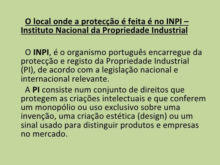 9. 9. <ul><li>O local onde a protecção é feita é no INPI – Instituto Nacional da Propriedade Industrial </li></ul><ul><li>O INPI , é o organismo português encarregue da protecção e registo da Propriedade Industrial (PI), de acordo com a legislação nacional e internacional relevante. </li></ul><ul><li>A PI consiste num conjunto de direitos que protegem as criações intelectuais e que conferem um monopólio ou uso exclusivo sobre uma invenção, uma criação estética (design) ou um sinal usado para distinguir produtos e empresas no mercado. </li></ul>