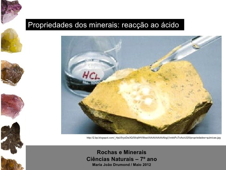 10. 10. Propriedades dos minerais: reacção ao ácido http://2.bp.blogspot.com/_HpU5ryxDw3Q/S6q9HVl8swI/AAAAAAAAAbg/j1mkkPuTnAs/s320/propriedades+quimicas.jpg Rochas e Minerais Ciências Naturais – 7º ano Maria João Drumond / Maio 2012