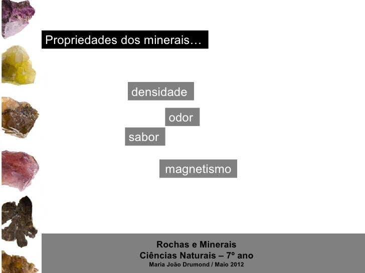 11. 11. Propriedades dos minerais… densidade odor sabor magnetismo Rochas e Minerais Ciências Naturais – 7º ano Maria João Drumond / Maio 2012