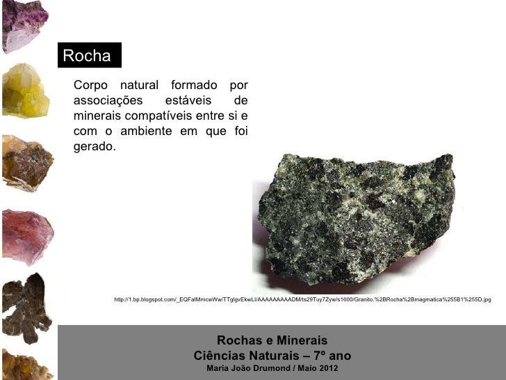 13. 13. Rocha Corpo natural formado por associações estáveis de minerais compatíveis entre si e com o ambiente em que foi gerado. http://1.bp.blogspot.com/_EQFaIMmcwWw/TTglgvEkwLI/AAAAAAAAADM/ts29Tuy7Zyw/s1600/Granito.%2BRocha%2Bmagmatica%255B1%255D.jpg Rochas e Minerais Ciências Naturais – 7º ano Maria João Drumond / Maio 2012