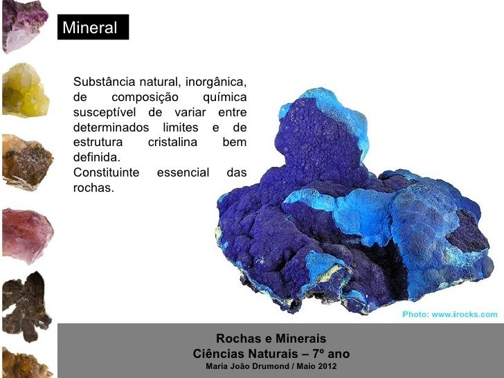 2. 2. Mineral Substância natural, inorgânica, de composição química susceptível de variar entre determinados limites e de estrutura cristalina bem definida. Constituinte essencial das rochas. http://www.sott.net/image/image/872/crystal-cave-1.jpg Rochas e Minerais Ciências Naturais – 7º ano Maria João Drumond / Maio 2012