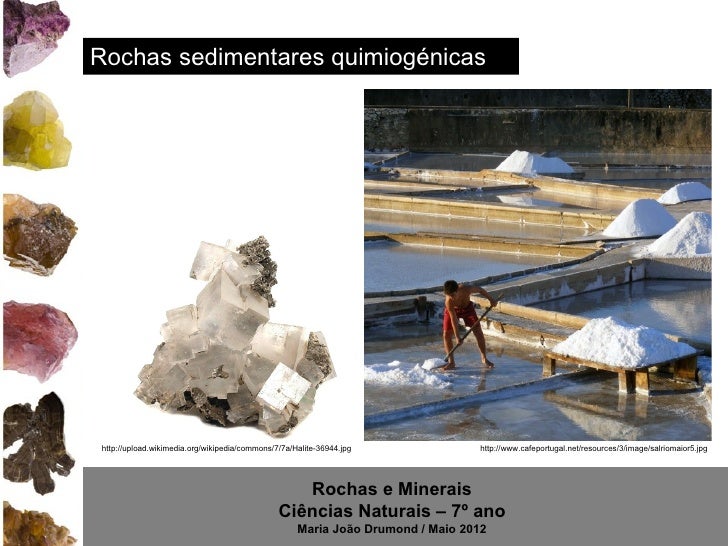 21. 21. Rochas sedimentares quimiogénicashttp://upload.wikimedia.org/wikipedia/commons/7/7a/Halite-36944.jpg http://www.cafeportugal.net/resources/3/image/salriomaior5.jpg Rochas e Minerais Ciências Naturais – 7º ano Maria João Drumond / Maio 2012