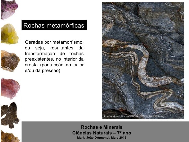 27. 27. Rochas metamórficasGeradas por metamorfismo,ou seja, resultantes datransformação de rochaspreexistentes, no interior dacrosta (por acção do calore/ou da pressão) http://farm4.static.flickr.com/3227/2897260233_24897666ba.jpg Rochas e Minerais Ciências Naturais – 7º ano Maria João Drumond / Maio 2012