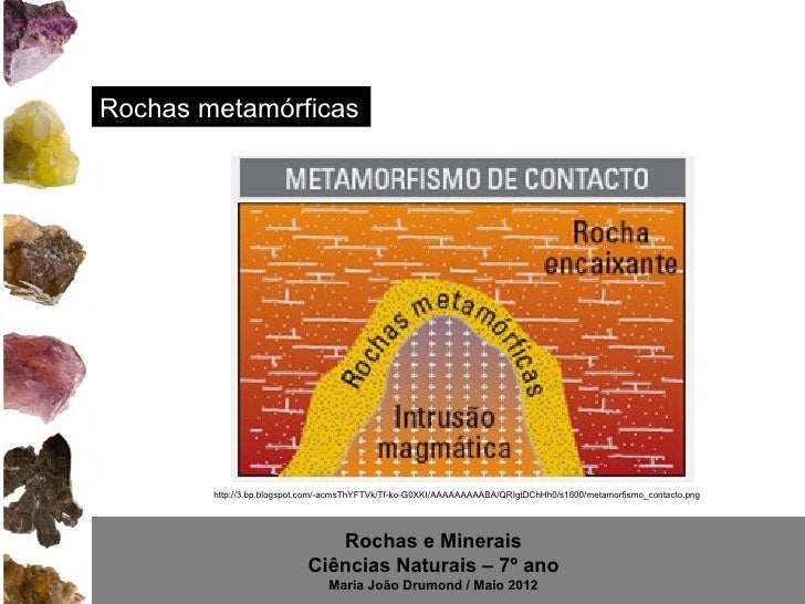 29. 29. Rochas metamórficas http://3.bp.blogspot.com/-acmsThYFTVk/Tf-ko-G0XKI/AAAAAAAAABA/QRIgtDChHh0/s1600/metamorfismo_contacto.png Rochas e Minerais Ciências Naturais – 7º ano Maria João Drumond / Maio 2012
