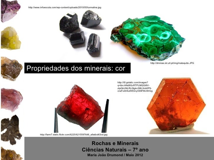 3. 3. http://www.infoescola.com/wp-content/uploads/2010/05/turmalina.jpg http://dminas.ist.utl.pt/img/malaquite.JPGPropriedades dos minerais: cor http://t0.gstatic.com/images? q=tbn:ANd9GcRTPLMQGt8V- ztpGkUNLRLQlgkv3MLXnb0P9- crwFx4X9u9WOny5S9FMvWrGg http://www.sott.net/image/image/872/crystal-cave-1.jpg http://farm7.static.flickr.com/6225/6215597648_a9a6cd63cd.jpg Rochas e Minerais Ciências Naturais – 7º ano Maria João Drumond / Maio 2012