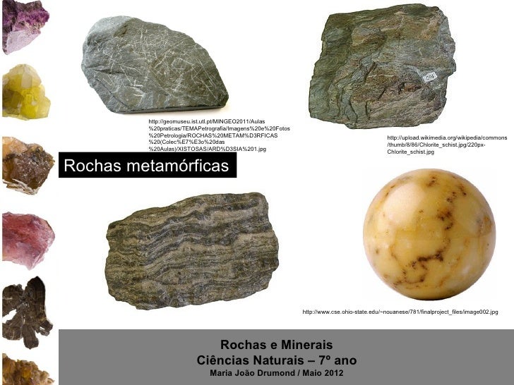 30. 30. http://geomuseu.ist.utl.pt/MINGEO2011/Aulas %20praticas/TEMAPetrografia/Imagens%20e%20Fotos %20Petrologia/ROCHAS%20METAM%D3RFICAS http://upload.wikimedia.org/wikipedia/commons %20(Colec%E7%E3o%20das /thumb/8/86/Chlorite_schist.jpg/220px- %20Aulas)/XISTOSAS/ARD%D3SIA%201.jpg Chlorite_schist.jpgRochas metamórficas http://www.cse.ohio-state.edu/~nouanese/781/finalproject_files/image002.jpg Rochas e Minerais Ciências Naturais – 7º ano Maria João Drumond / Maio 2012