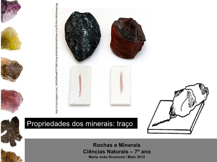 5. 5. http://4.bp.blogspot.com/_3WIGHBwtpF8/TOMC4vptvdI/AAAAAAAAADo/wu-6JaT91l4/s1600/streak.jpgPropriedades dos minerais: traço http://www.sott.net/image/image/872/crystal-cave-1.jpg Rochas e Minerais Ciências Naturais – 7º ano Maria João Drumond / Maio 2012