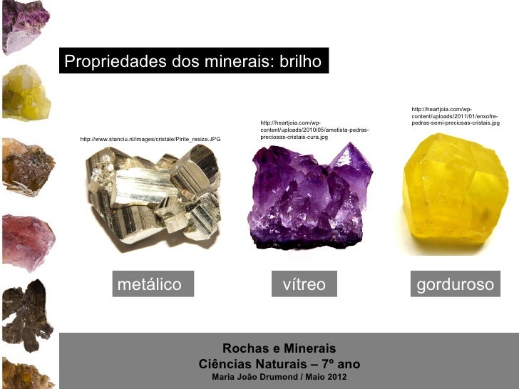 6. 6. Propriedades dos minerais: brilho http://heartjoia.com/wp- content/uploads/2011/01/enxofre- http://heartjoia.com/wp- pedras-semi-preciosas-cristais.jpg content/uploads/2010/05/ametista-pedras- http://www.stanciu.nl/images/cristale/Pirite_resize.JPG preciosas-cristais-cura.jpg metálico vítreo gorduroso Rochas e Minerais Ciências Naturais – 7º ano Maria João Drumond / Maio 2012