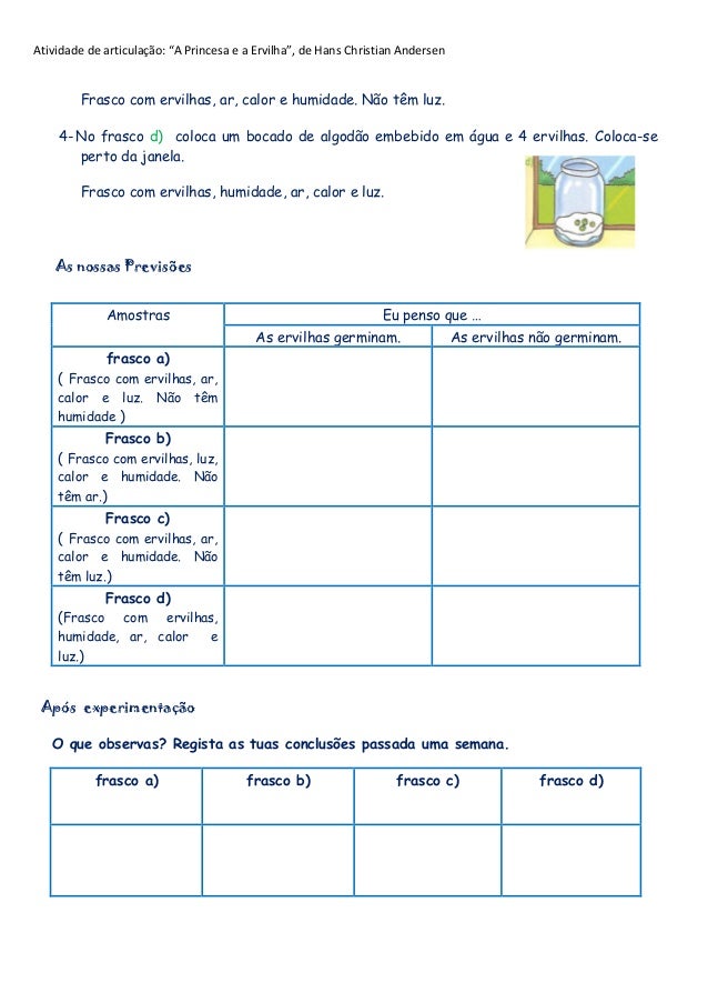 1. 1. Atividade de articulação: “A Princesa e a Ervilha”, de Hans Christian Andersen Protocolo Experimental Aluno:_____________________________________Questão –Problema: Será que a ervilha germina? Quais os fatores que interferem? O que pensas? ___________________________________________________________________? ___________________________________________________________________Agora vamos experimentarMaterial:  16 ervilhas  1 tampa  4 frascos de vidro  água  algodão Procedimento: 1- No frasco a) coloca um bocado de algodão e 4 ervilhas. Coloca-se perto da janela. Frasco com ervilhas, ar, calor e luz. Não têm humidade. 2- No frasco b) coloca um bocado de algodão embebido em água e 4 ervilhas. Tapa-se o frasco com a tampa. Coloca-se perto da janela. Frasco com ervilhas, luz, calor e humidade. Não têm ar. 3- No frasco c) coloca um bocado de algodão embebido em água e 4 ervilhas. Coloca-se dentro do armário.
