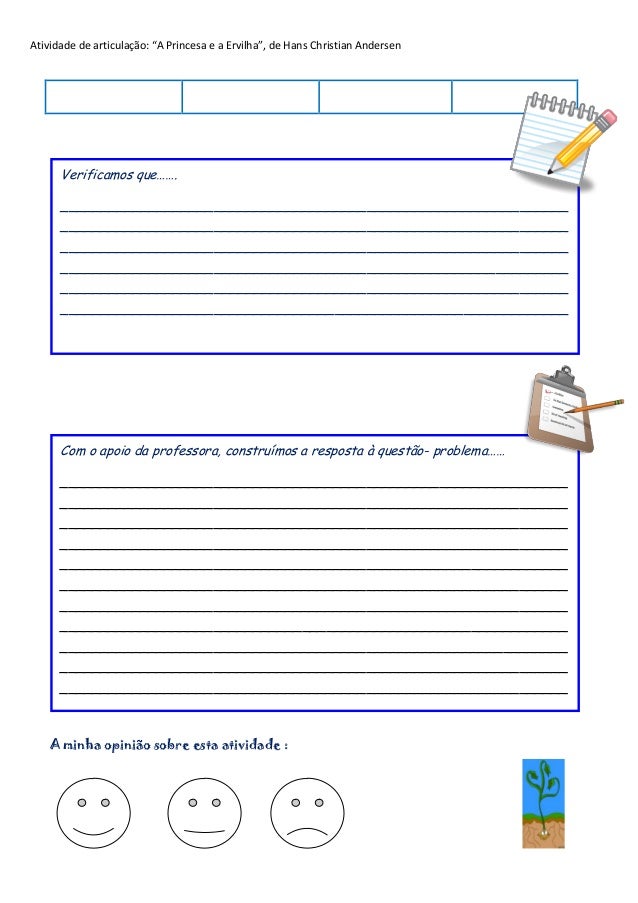 3. 3. Atividade de articulação: “A Princesa e a Ervilha”, de Hans Christian Andersen Verificamos que……. _______________________________________________________________ _______________________________________________________________ _______________________________________________________________ _______________________________________________________________ _______________________________________________________________ _______________________________________________________________ Com o apoio da professora, construímos a resposta à questão- problema…… _______________________________________________________________ _______________________________________________________________ _______________________________________________________________ _______________________________________________________________ _______________________________________________________________ _______________________________________________________________ _______________________________________________________________ _______________________________________________________________ _______________________________________________________________ _______________________________________________________________ _______________________________________________________________ A minha opinião sobre esta atividade :