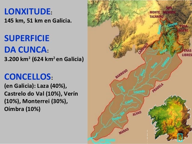 1. 1. LONXITUDE: 145 km, 51 km en Galicia. SUPERFICIE DA CUNCA: 3.200 km2 (624 km2 en Galicia) CONCELLOS: (en Galicia): Laza (40%), Castrelo do Val (10%), Verín (10%), Monterrei (30%), Oímbra (10%)