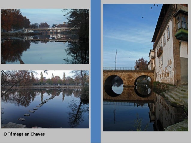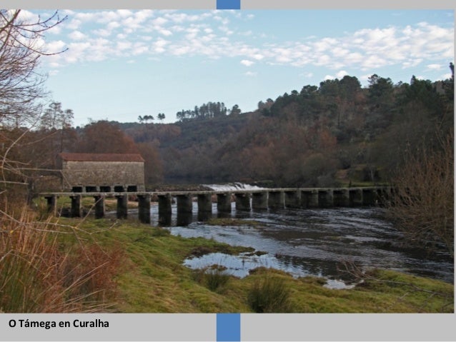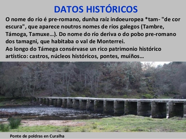 53. 53. DATOS HISTÓRICOS O nome do río é pre-romano, dunha raíz indoeuropea *tam- "de cor escura", que aparece noutros nomes de ríos galegos (Tambre, Támoga, Tamuxe…). Do nome do río deriva o do pobo pre-romano dos tamagni, que habitaba o val de Monterrei. Ao longo do Támega consérvase un rico patrimonio histórico artístico: castros, núcleos históricos, pontes, muíños… Ponte de poldras en Curalha