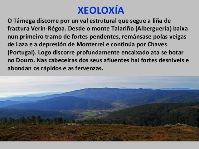32. 32. XEOLOXÍA O Támega discorre por un val estrutural que segue a liña de fractura Verín-Régoa. Desde o monte Talariño (Alberguería) baixa nun primeiro tramo de fortes pendentes, remánsase polas veigas de Laza e a depresión de Monterrei e continúa por Chaves (Portugal). Logo discorre profundamente encaixado ata se botar no Douro. Nas cabeceiras dos seus afluentes hai fortes desniveis e abondan os rápidos e as fervenzas.