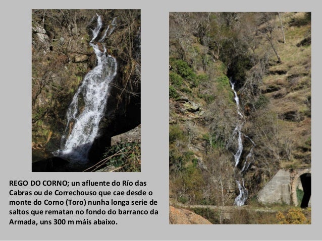 36. 36. REGO DO CORNO; un afluente do Río das Cabras ou de Correchouso que cae desde o monte do Corno (Toro) nunha longa serie de saltos que rematan no fondo do barranco da Armada, uns 300 m máis abaixo.