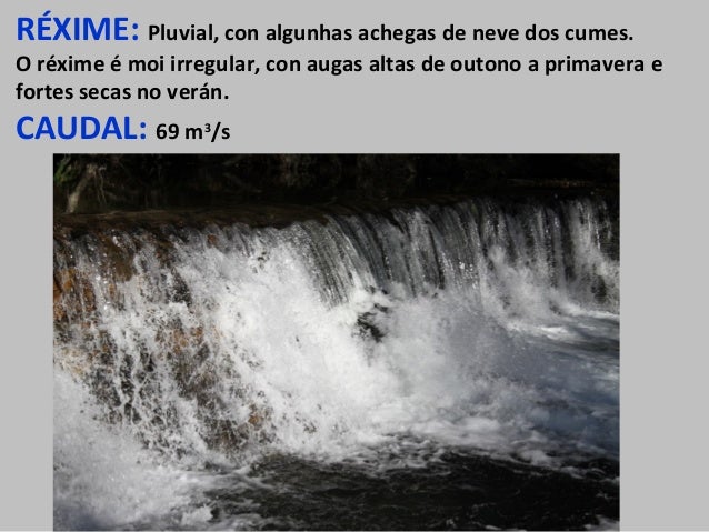 3. 3. RÉXIME: Pluvial, con algunhas achegas de neve dos cumes. O réxime é moi irregular, con augas altas de outono a primavera e fortes secas no verán. CAUDAL: 69 m /s 3