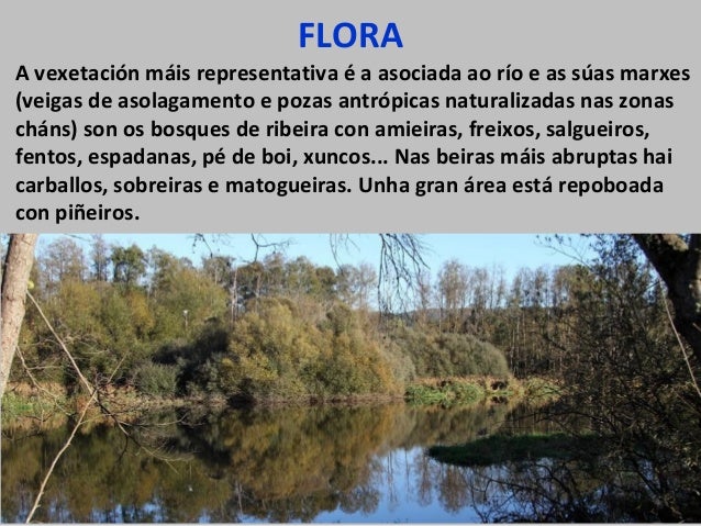 44. 44. FLORA A vexetación máis representativa é a asociada ao río e as súas marxes (veigas de asolagamento e pozas antrópicas naturalizadas nas zonas cháns) son os bosques de ribeira con amieiras, freixos, salgueiros, fentos, espadanas, pé de boi, xuncos... Nas beiras máis abruptas hai carballos, sobreiras e matogueiras. Unha gran área está repoboada con piñeiros.