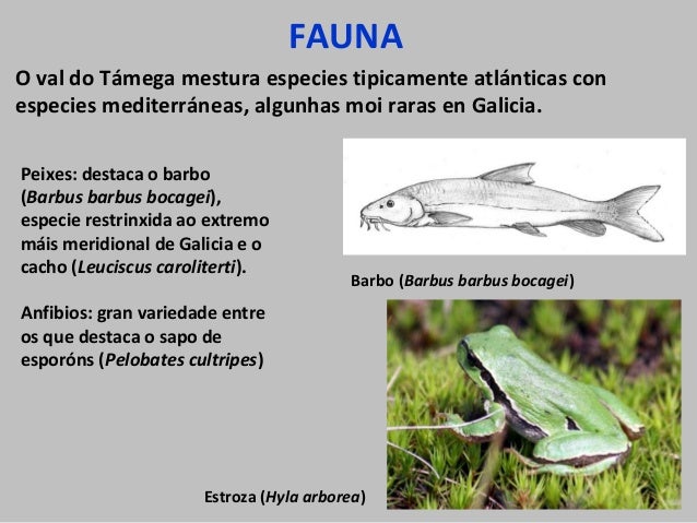 46. 46. FAUNA O val do Támega mestura especies tipicamente atlánticas con especies mediterráneas, algunhas moi raras en Galicia. Peixes: destaca o barbo (Barbus barbus bocagei), especie restrinxida ao extremo máis meridional de Galicia e o cacho (Leuciscus caroliterti). Barbo (Barbus barbus bocagei) Anfibios: gran variedade entre os que destaca o sapo de esporóns (Pelobates cultripes) Estroza (Hyla arborea)