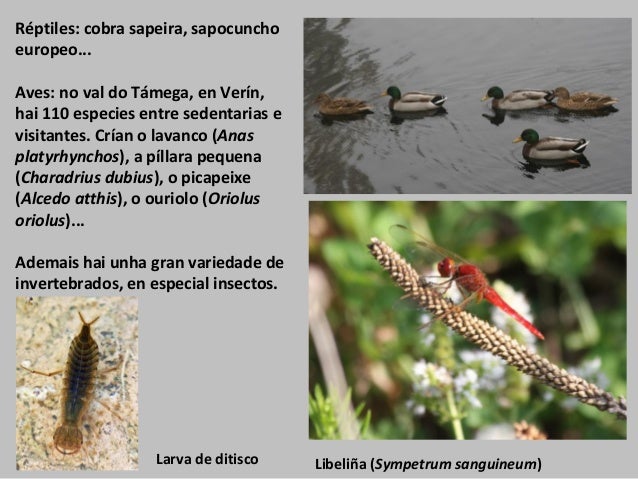 47. 47. Réptiles: cobra sapeira, sapocuncho europeo... Aves: no val do Támega, en Verín, hai 110 especies entre sedentarias e visitantes. Crían o lavanco (Anas platyrhynchos), a píllara pequena (Charadrius dubius), o picapeixe (Alcedo atthis), o ouriolo (Oriolus oriolus)... Ademais hai unha gran variedade de invertebrados, en especial insectos. Larva de ditisco Libeliña (Sympetrum sanguineum)