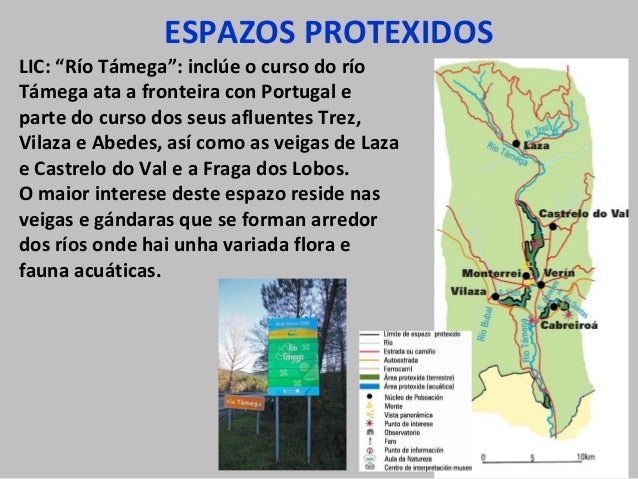 48. 48. ESPAZOS PROTEXIDOS LIC: “Río Támega”: inclúe o curso do río Támega ata a fronteira con Portugal e parte do curso dos seus afluentes Trez, Vilaza e Abedes, así como as veigas de Laza e Castrelo do Val e a Fraga dos Lobos. O maior interese deste espazo reside nas veigas e gándaras que se forman arredor dos ríos onde hai unha variada flora e fauna acuáticas.