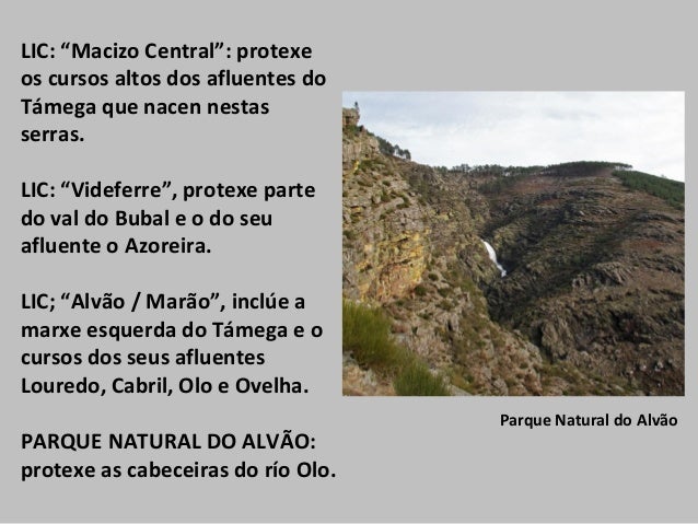 49. 49. LIC: “Macizo Central”: protexe os cursos altos dos afluentes do Támega que nacen nestas serras. LIC: “Videferre”, protexe parte do val do Bubal e o do seu afluente o Azoreira. LIC; “Alvão / Marão”, inclúe a marxe esquerda do Támega e o cursos dos seus afluentes Louredo, Cabril, Olo e Ovelha. PARQUE NATURAL DO ALVÃO: protexe as cabeceiras do río Olo. Parque Natural do Alvão