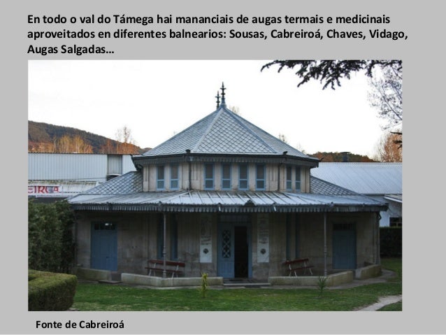 51. 51. En todo o val do Támega hai mananciais de augas termais e medicinais aproveitados en diferentes balnearios: Sousas, Cabreiroá, Chaves, Vidago, Augas Salgadas… Fonte de Cabreiroá