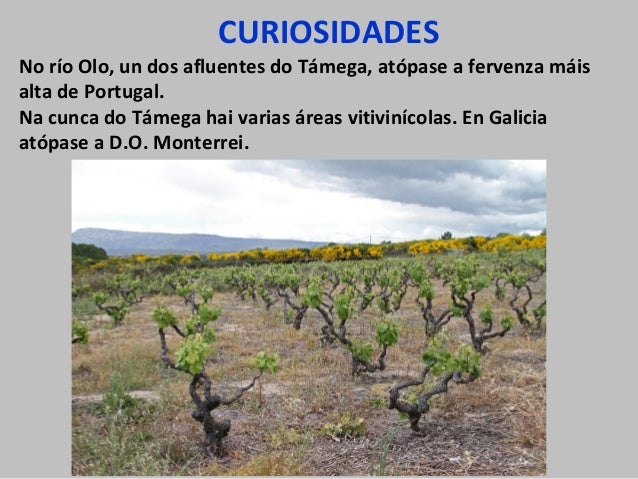 56. 56. CURIOSIDADES No río Olo, un dos afluentes do Támega, atópase a fervenza máis alta de Portugal. Na cunca do Támega hai varias áreas vitivinícolas. En Galicia atópase a D.O. Monterrei.