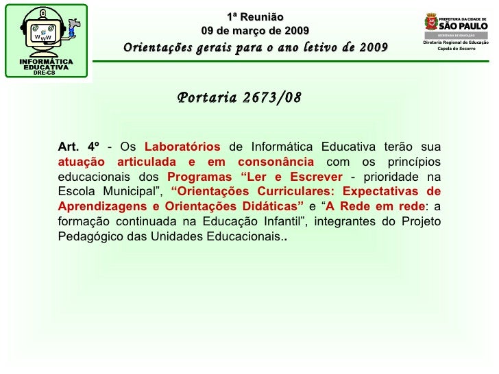10. 10. Diretoria Regional de Educação Capela do Socorro Portaria 2673/08 1ª Reunião 09 de março de 2009 Orientações gerais para o ano letivo de 2009 Art. 4º - Os Laboratórios de Informática Educativa terão sua atuação articulada e em consonância com os princípios educacionais dos Programas “Ler e Escrever - prioridade na Escola Municipal”, “Orientações Curriculares: Expectativas de Aprendizagens e Orientações Didáticas” e “ A Rede em rede : a formação continuada na Educação Infantil”, integrantes do Projeto Pedagógico das Unidades Educacionais. .