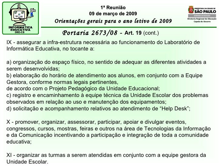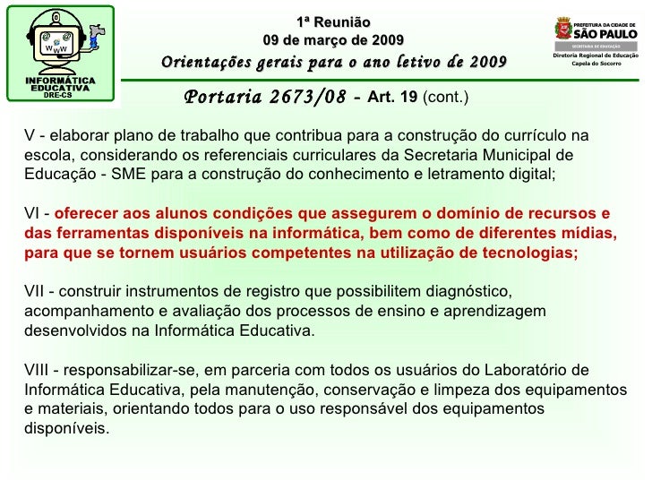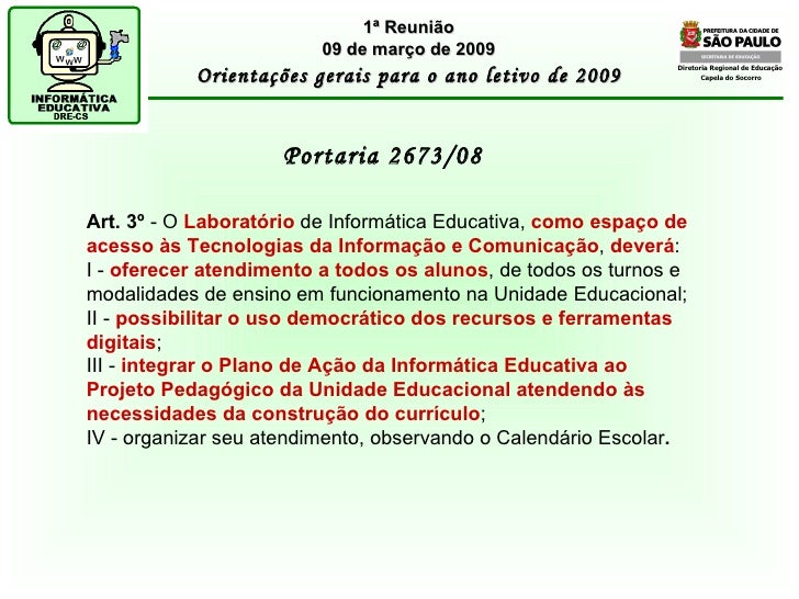 9. 9. Diretoria Regional de Educação Capela do Socorro Portaria 2673/08 1ª Reunião 09 de março de 2009 Orientações gerais para o ano letivo de 2009 Art. 3º - O Laboratório de Informática Educativa, como espaço de acesso às Tecnologias da Informação e Comunicação , deverá : I - oferecer atendimento a todos os alunos , de todos os turnos e modalidades de ensino em funcionamento na Unidade Educacional; II - possibilitar o uso democrático dos recursos e ferramentas digitais ; III - integrar o Plano de Ação da Informática Educativa ao Projeto Pedagógico da Unidade Educacional atendendo às necessidades da construção do currículo ; IV - organizar seu atendimento, observando o Calendário Escolar .