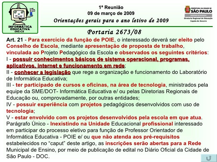 14. 14. Diretoria Regional de Educação Capela do Socorro Portaria 2673/08 1ª Reunião 09 de março de 2009 Orientações gerais para o ano letivo de 2009 Art. 21 - Para exercício da função de POIE , o interessado deverá ser eleito pelo Conselho de Escola , mediante apresentação de proposta de trabalho , vinculada ao P rojeto P edagógico da Escola e observados os seguintes critérios : I - possuir conhecimentos básicos de sistema operacional, programas, aplicativos, internet e funcionamento em rede ; II - conhecer a legislação que rege a organização e funcionamento do Laboratório de Informática Educativa; III - ter participado de cursos e oficinas, na área de tecnologia , ministrados pela equipe da SME/DOT- Informática Educativa e/ ou pelas Diretorias Regionais de Educação ou, comprovadamente, por outras entidades; IV - possuir experiência com projetos pedagógicos desenvolvidos com uso de tecnologia ; V - estar envolvido com os projetos desenvolvidos pela escola em que atua . Parágrafo Único - Inexistindo na Unidade Educacional profissional interessado em participar do processo eletivo para função de Professor Orientador de Informática Educativa - POIE e/ ou que não atenda aos pré-requisitos estabelecidos no “caput” deste artigo, as inscrições serão abertas para a Rede Municipal de Ensino, por meio de publicação de edital no Diário Oficial da Cidade de São Paulo - DOC.