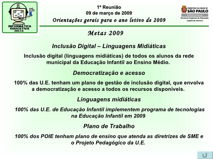 15. 15. Diretoria Regional de Educação Capela do Socorro Metas 2009 1ª Reunião 09 de março de 2009 Orientações gerais para o ano letivo de 2009 <ul><ul><li>Inclusão Digital – Linguagens Midiáticas </li></ul></ul><ul><ul><li>Inclusão digital (linguagens midiáticas) de todos os alunos da rede municipal da Educação Infantil ao Ensino Médio. </li></ul></ul><ul><ul><li>Democratização e acesso </li></ul></ul><ul><ul><li>100% das U.E. tenham um plano de gestão de inclusão digital, que envolva a democratização e acesso a todos os recursos disponíveis. </li></ul></ul><ul><ul><li>Linguagens midiáticas </li></ul></ul><ul><ul><li>100% das U.E. de Educação Infantil implementem programa de tecnologias na Educação Infantil em 2009 </li></ul></ul><ul><ul><li>Plano de Trabalho </li></ul></ul><ul><ul><li>100% dos POIE tenham plano de ensino que atenda as diretrizes de SME e o Projeto Pedagógico da U.E. </li></ul></ul>