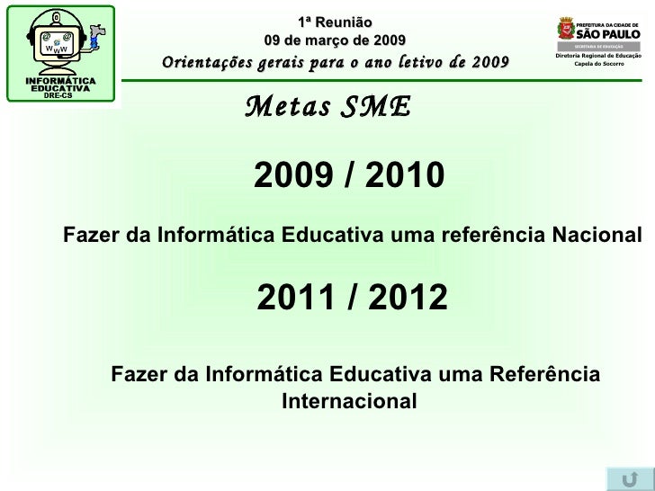 16. 16. Diretoria Regional de Educação Capela do Socorro Metas SME 1ª Reunião 09 de março de 2009 Orientações gerais para o ano letivo de 2009 <ul><ul><li>2009 / 2010 </li></ul></ul><ul><ul><li>Fazer da Informática Educativa uma referência Nacional </li></ul></ul><ul><ul><li>2011 / 2012 </li></ul></ul><ul><ul><li>Fazer da Informática Educativa uma Referência Internacional </li></ul></ul>