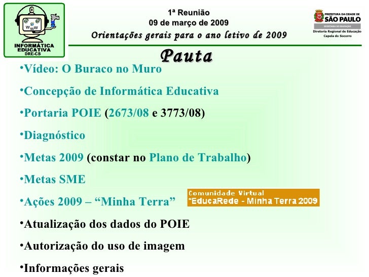 2. 2. Diretoria Regional de Educação Capela do Socorro Pauta 1ª Reunião 09 de março de 2009 Orientações gerais para o ano letivo de 2009 <ul><li>Vídeo: O Buraco no Muro </li></ul><ul><li>Concepção de Informática Educativa </li></ul><ul><li>Portaria POIE ( 2673/08 e 3773/08) </li></ul><ul><li>Diagnóstico </li></ul><ul><li>Metas 2009 (constar no Plano de Trabalho ) </li></ul><ul><li>Metas SME </li></ul><ul><li>Ações 2009 – “Minha Terra” </li></ul><ul><li>Atualização dos dados do POIE </li></ul><ul><li>Autorização do uso de imagem </li></ul><ul><li>Informações gerais </li></ul>