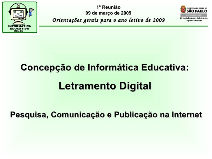 3. 3. Diretoria Regional de Educação Capela do Socorro Concepção de Informática Educativa: Letramento Digital Pesquisa, Comunicação e Publicação na Internet 1ª Reunião 09 de março de 2009 Orientações gerais para o ano letivo de 2009