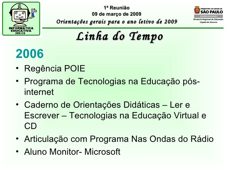 4. 4. Diretoria Regional de Educação Capela do Socorro Linha do Tempo 1ª Reunião 09 de março de 2009 Orientações gerais para o ano letivo de 2009 <ul><li>2006 </li></ul><ul><li>Regência POIE </li></ul><ul><li>Programa de Tecnologias na Educação pós-internet </li></ul><ul><li>Caderno de Orientações Didáticas – Ler e Escrever – Tecnologias na Educação Virtual e CD </li></ul><ul><li>Articulação com Programa Nas Ondas do Rádio </li></ul><ul><li>Aluno Monitor- Microsoft </li></ul>