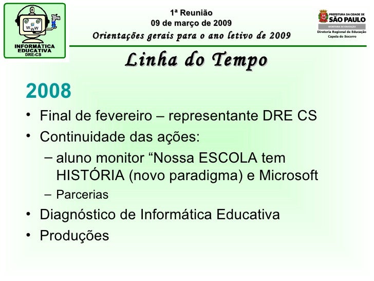 6. 6. Diretoria Regional de Educação Capela do Socorro Linha do Tempo 1ª Reunião 09 de março de 2009 Orientações gerais para o ano letivo de 2009 <ul><li>2008 </li></ul><ul><li>Final de fevereiro – representante DRE CS </li></ul><ul><li>Continuidade das ações: </li></ul><ul><ul><li>aluno monitor “Nossa ESCOLA tem HISTÓRIA (novo paradigma) e Microsoft </li></ul></ul><ul><ul><li>Parcerias </li></ul></ul><ul><li>Diagnóstico de Informática Educativa </li></ul><ul><li>Produções </li></ul>