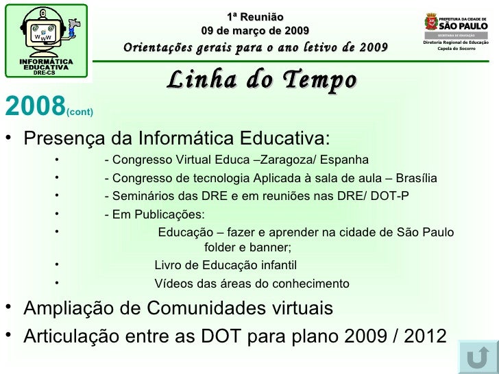7. 7. Diretoria Regional de Educação Capela do Socorro Linha do Tempo 1ª Reunião 09 de março de 2009 Orientações gerais para o ano letivo de 2009 <ul><li>2008 (cont) </li></ul><ul><li>Presença da Informática Educativa: </li></ul><ul><ul><ul><li>- Congresso Virtual Educa –Zaragoza/ Espanha </li></ul></ul></ul><ul><ul><ul><li>- Congresso de tecnologia Aplicada à sala de aula – Brasília </li></ul></ul></ul><ul><ul><ul><li>- Seminários das DRE e em reuniões nas DRE/ DOT-P </li></ul></ul></ul><ul><ul><ul><li>- Em Publicações: </li></ul></ul></ul><ul><ul><ul><li> Educação – fazer e aprender na cidade de São Paulo folder e banner; </li></ul></ul></ul><ul><ul><ul><li>Livro de Educação infantil </li></ul></ul></ul><ul><ul><ul><li>Vídeos das áreas do conhecimento </li></ul></ul></ul><ul><li>Ampliação de Comunidades virtuais </li></ul><ul><li>Articulação entre as DOT para plano 2009 / 2012 </li></ul>