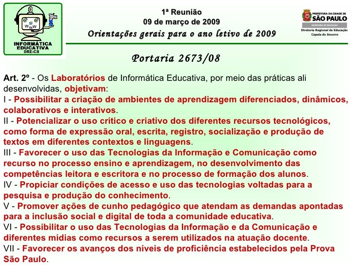 8. 8. Diretoria Regional de Educação Capela do Socorro Portaria 2673/08 1ª Reunião 09 de março de 2009 Orientações gerais para o ano letivo de 2009 Art. 2º - Os Laboratórios de Informática Educativa, por meio das práticas ali desenvolvidas, objetivam : I - Possibilitar a criação de ambientes de aprendizagem diferenciados, dinâmicos, colaborativos e interativos . II - Potencializar o uso crítico e criativo dos diferentes recursos tecnológicos, como forma de expressão oral, escrita, registro, socialização e produção de textos em diferentes contextos e linguagens . III - Favorecer o uso das Tecnologias da Informação e Comunicação como recurso no processo ensino e aprendizagem, no desenvolvimento das competências leitora e escritora e no processo de formação dos alunos . IV - Propiciar condições de acesso e uso das tecnologias voltadas para a pesquisa e produção do conhecimento . V - Promover ações de cunho pedagógico que atendam as demandas apontadas para a inclusão social e digital de toda a comunidade educativa . VI - Possibilitar o uso das Tecnologias da Informação e da Comunicação e diferentes mídias como recursos a serem utilizados na atuação docente . VII - Favorecer os avanços dos níveis de proficiência estabelecidos pela Prova São Paulo .