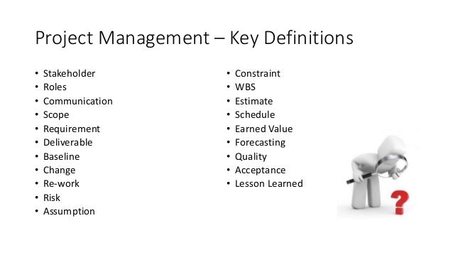 13. 13. Project Management – Key Definitions • Stakeholder • Roles • Communication • Scope • Requirement • Deliverable • Baseline • Change • Re-work • Risk • Assumption • Constraint • WBS • Estimate • Schedule • Earned Value • Forecasting • Quality • Acceptance • Lesson Learned