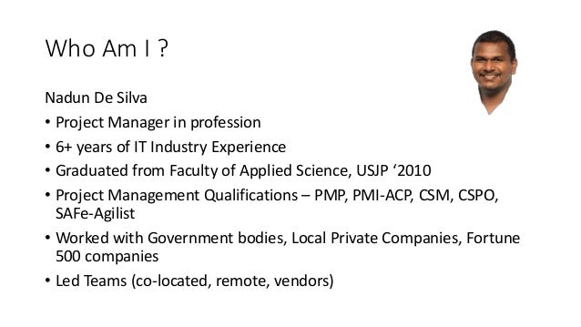 2. 2. Who Am I ? Nadun De Silva • Project Manager in profession • 6+ years of IT Industry Experience • Graduated from Faculty of Applied Science, USJP ‘2010 • Project Management Qualifications – PMP, PMI-ACP, CSM, CSPO, SAFe-Agilist • Worked with Government bodies, Local Private Companies, Fortune 500 companies • Led Teams (co-located, remote, vendors)