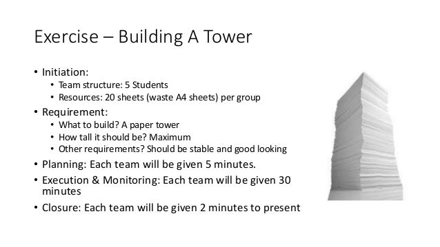 21. 21. Exercise – Building A Tower • Initiation: • Team structure: 5 Students • Resources: 20 sheets (waste A4 sheets) per group • Requirement: • What to build? A paper tower • How tall it should be? Maximum • Other requirements? Should be stable and good looking • Planning: Each team will be given 5 minutes. • Execution & Monitoring: Each team will be given 30 minutes • Closure: Each team will be given 2 minutes to present