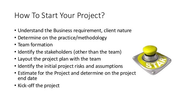 22. 22. How To Start Your Project? • Understand the Business requirement, client nature • Determine on the practice/methodology • Team formation • Identify the stakeholders (other than the team) • Layout the project plan with the team • Identify the initial project risks and assumptions • Estimate for the Project and determine on the project end date • Kick-off the project